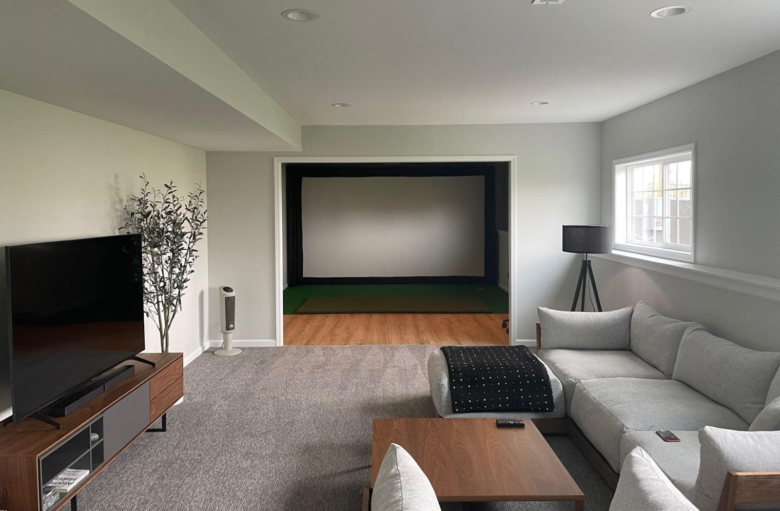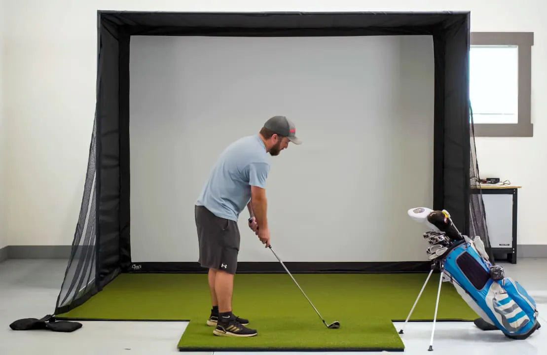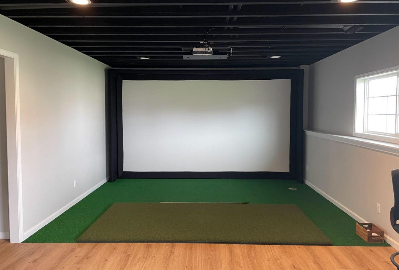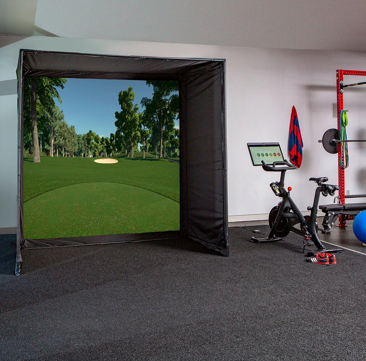 We recommend placing your golf simulator enclosure a minimum of 12-16 inches of buffer space away from the wall, behind the impact screen itself, and approximately 2-4 inches of buffer space away from side walls and ceilings. For the safety of both the golfer and the screen we recommend standing a minimum distance of 12 to 15 feet away from the screen. For safety reasons, a minimum of 16-18 feet of depth is preferable.